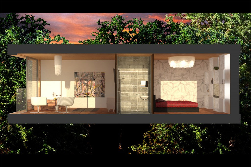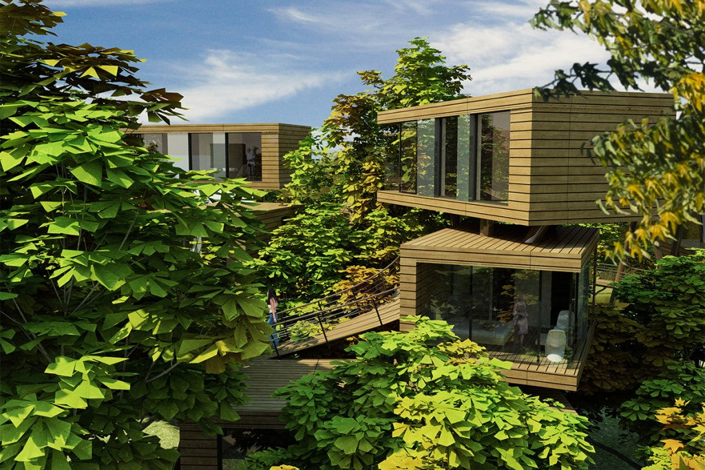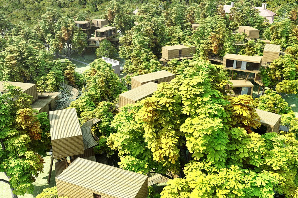 45 miles from Vienna, among the big, ancient trees of the botanical garden of the Nádasdy castle. Floating hotel, that would have had 57 floating houses, and 17 rooms found in the castle. The project is unique in Europe and has a valid construction permit. Unfortunately, it was canceled due to the pandemic.